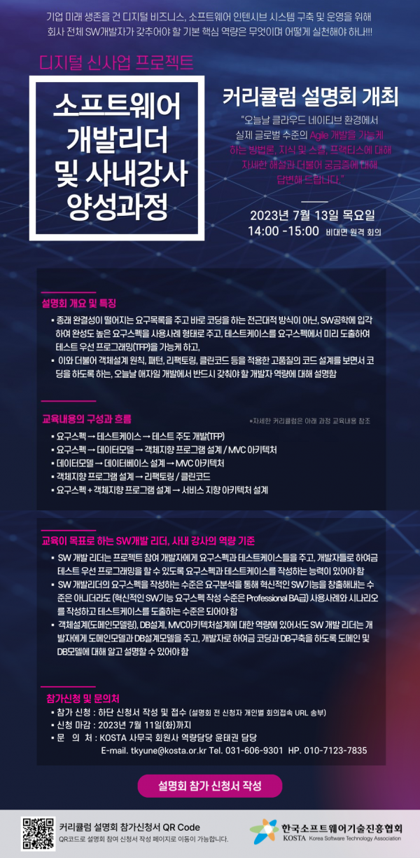 [홍보] (재학생, 휴학생, 졸업생) (SW기술협) 커리큘럼 설명회 개최 D-7, 「SW개발리더 및 사내강사 양성과정」 안내 페이지 정보 작성자 대학일자리센터 작성일23-07-06 10:44 조회1,944회 댓글0건 관련링크 이전글 다음글 목록 본문 이미지를 확인해주시길 바랍니다. 댓글목록 등록된 댓글이 없습니다. 이전글 다음글 목록