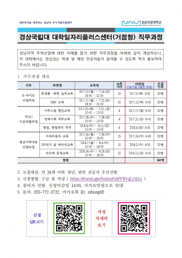 [홍보] (만 34세 이하 청년) (경상국립대) 2023년 대학일자리플러스센터(거점형) 직무과정(8종) 프로그램 참여 안내