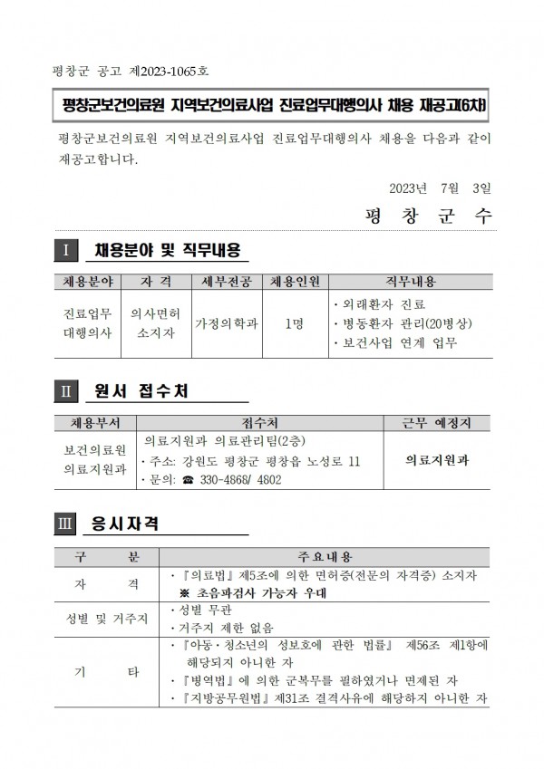 [본문] 평창군 지역보건의료사업 진료업무대행의사 채용 공고 홍보 협조.pdf