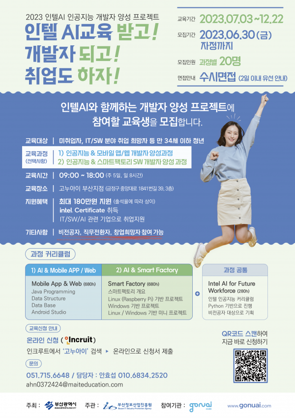 [홍보] (미취업자, IT/SW 분야 취업 희망자) 2023년 인텔AI 인공지능 개발자 양성 프로젝트 교육생 추가모집 안내 페이지 정보 작성자 대학일자리센터 작성일23-06-23 10:35 조회1,836회 댓글0건 관련링크 이전글 다음글 목록 본문 . 댓글목록 등록된 댓글이 없습니다. 이전글 다음글 목록