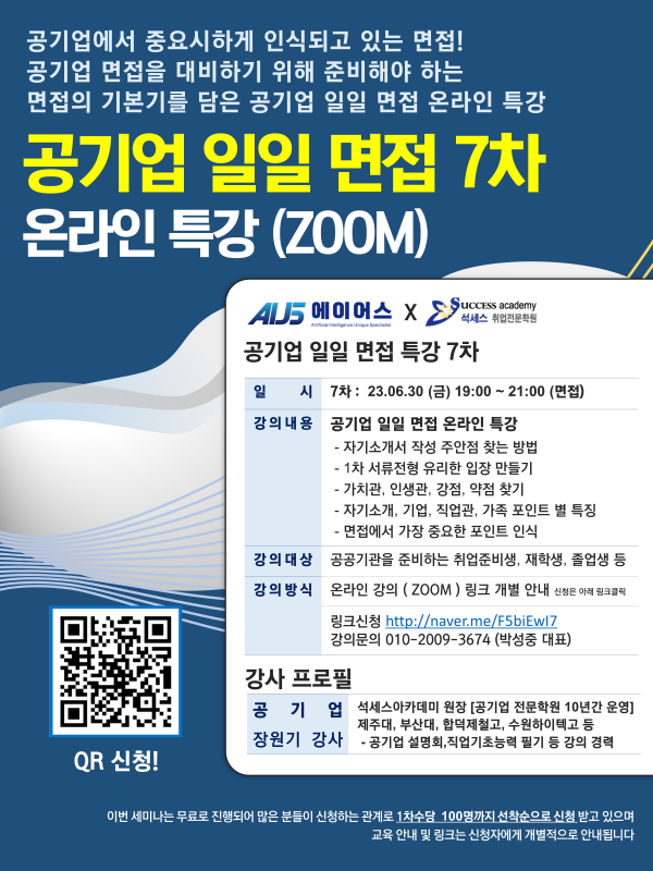 이번에 취업준비생들을 위해 공기업 일일면접 7차 온라인 특강을 진행합니다.