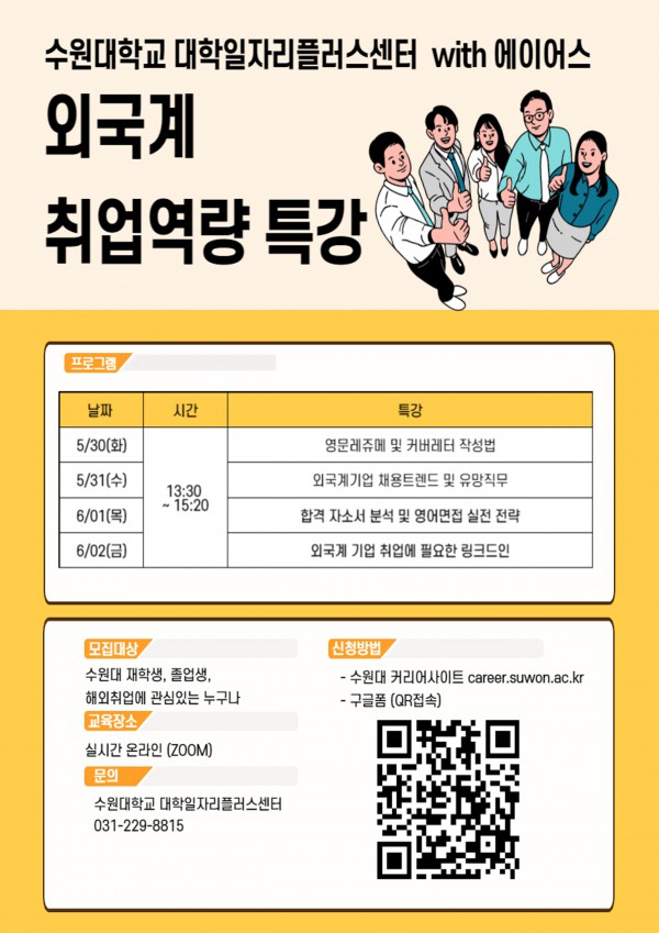 신청대상 : 만 34세 이하 청년 (해외취업에 관심있는 누구나, 수원대 재학생, 졸