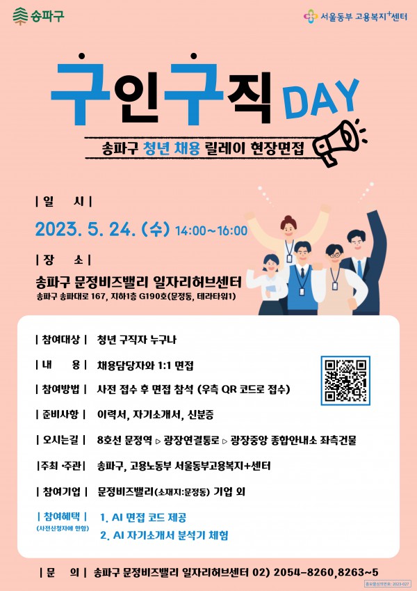 [홍보] (청년 구직자 누구나) (문정비즈밸리 일자리허브센터) '구인구직 DAY' 송파구 청년 채용 릴레이 현장 면접 안내 페이지 정보 작성자 대학일자리센터 작성일23-05-15 13:14 조회1,862회 댓글0건 관련링크 이전글 다음글 목록 본문 사진을 참고해주세요. 댓글목록 등록된 댓글이 없습니다. 이전글 다음글 목록