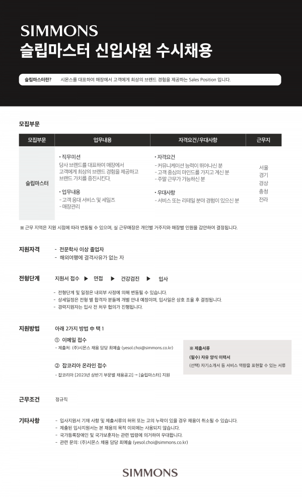 [채용] ((주)시몬스) 슬립마스터(Sales) 신입 채용공고
